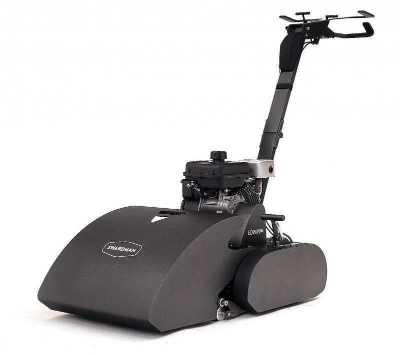Zakupte použitou sekačku Swardman Edwin 55 v antracitové barvě s 6nožovým vřetenem. 20 % sleva. Sekačka obsahuje praktická transportní kolečka.